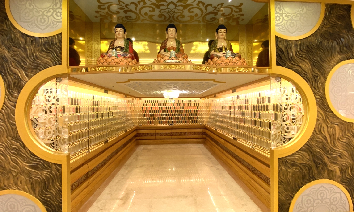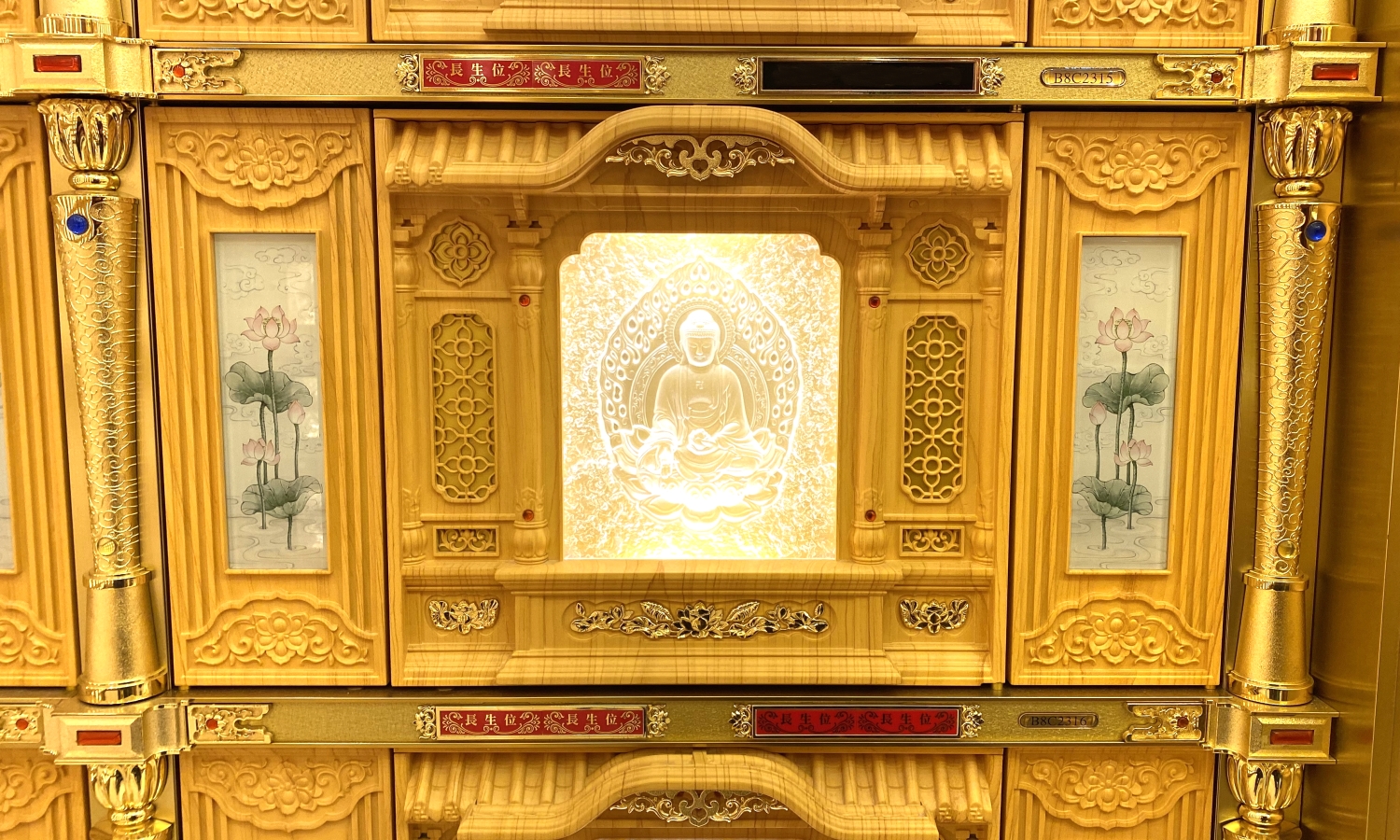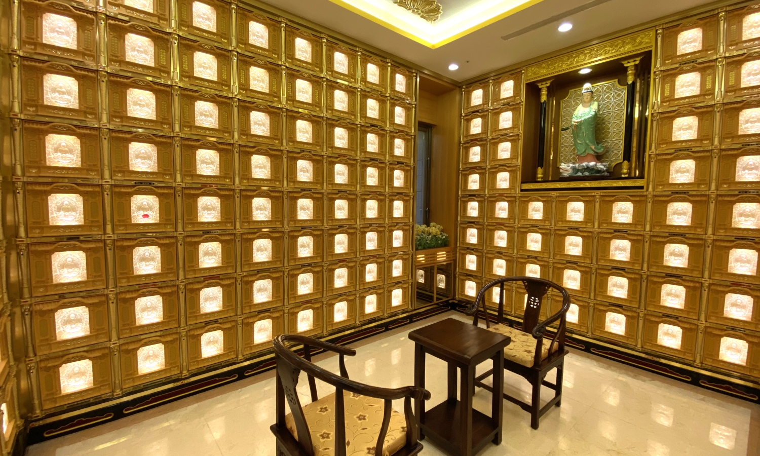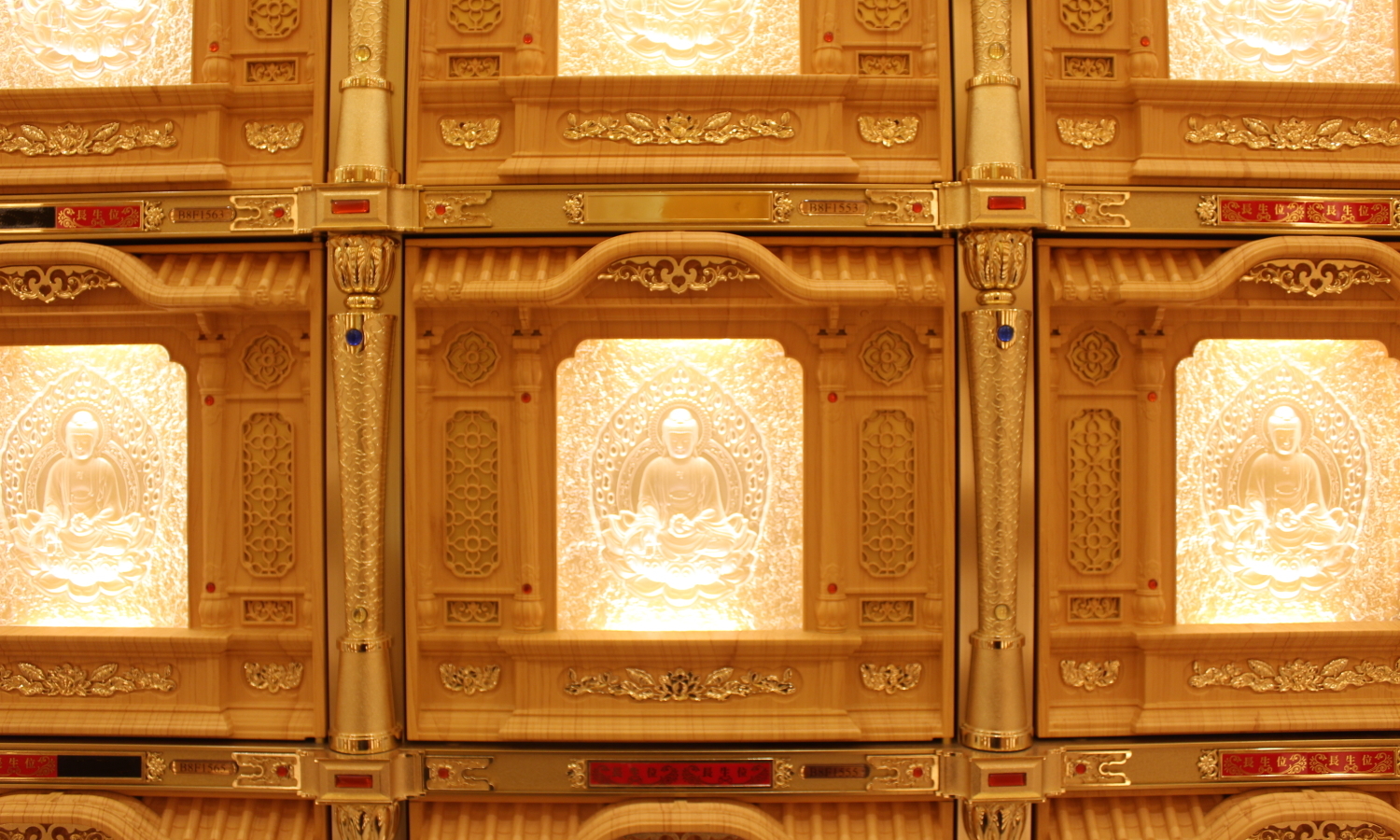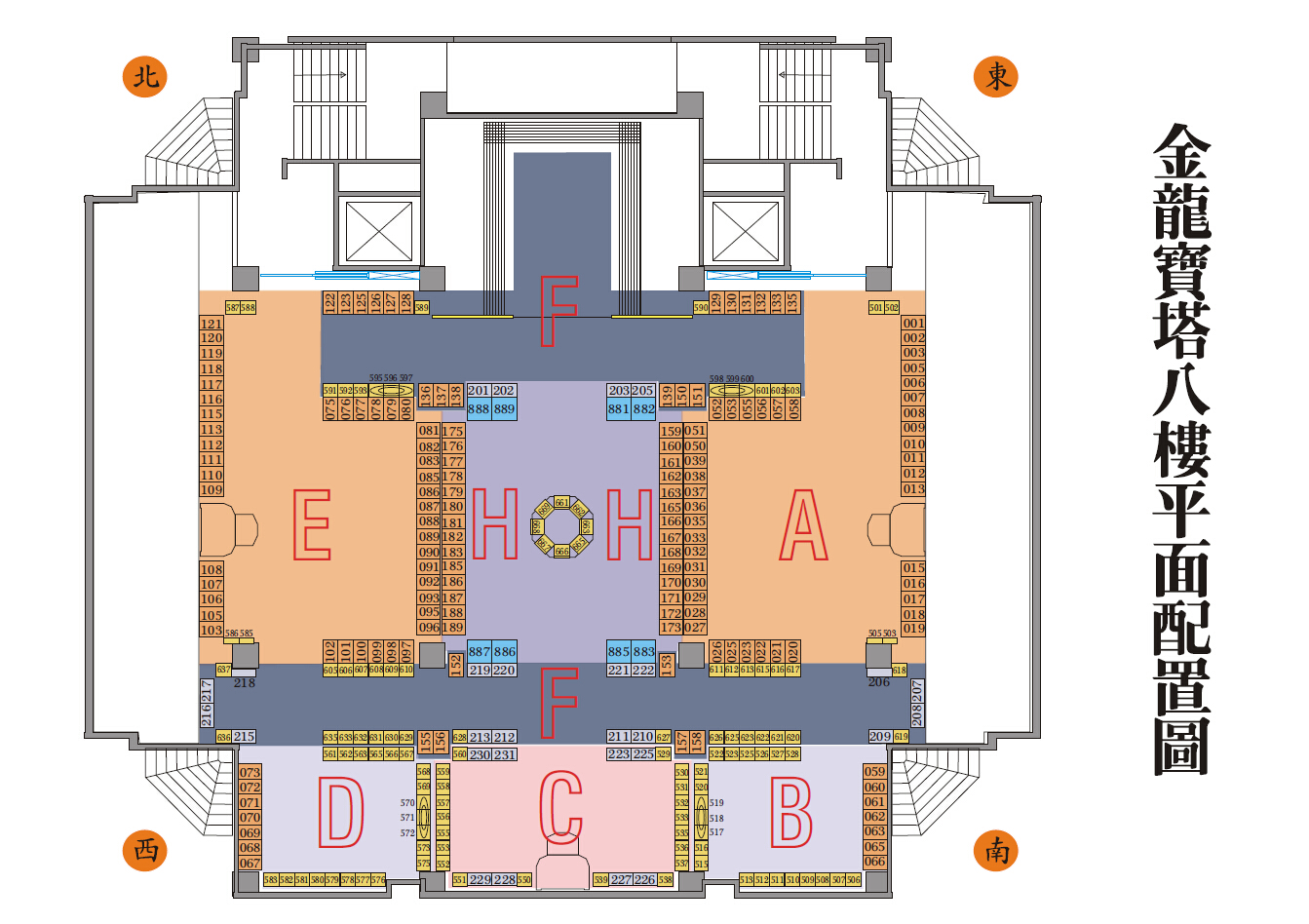 金龍寶塔八樓塔位區,樓層挑高四米,牌位區供奉三寶佛,中間佛龕供奉西方三聖及地藏王菩薩。兩旁耳房供奉觀世音菩薩、中間耳房供奉彌勒佛。