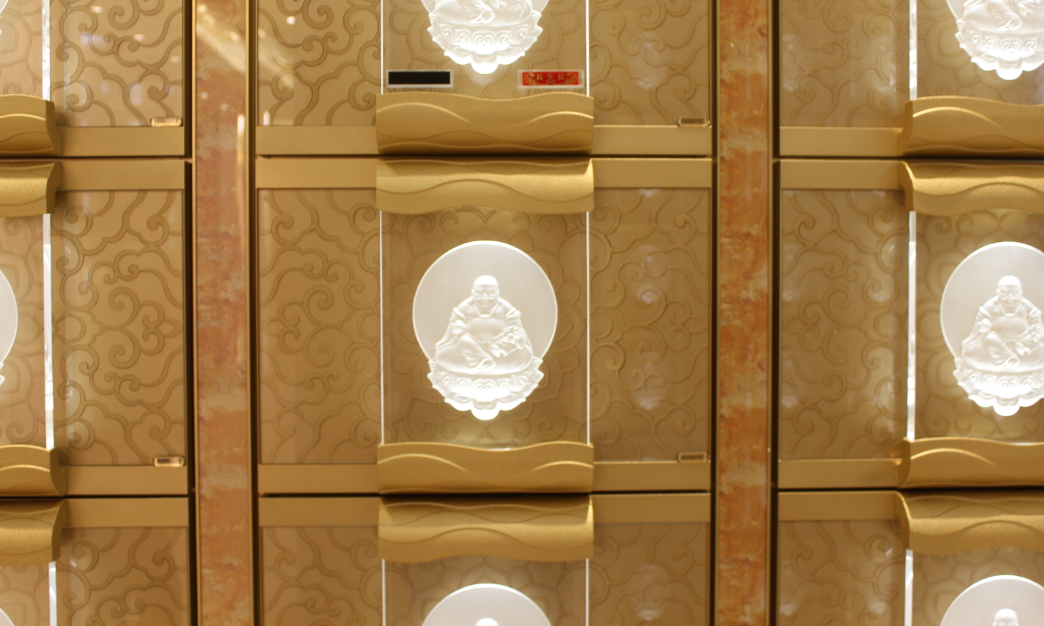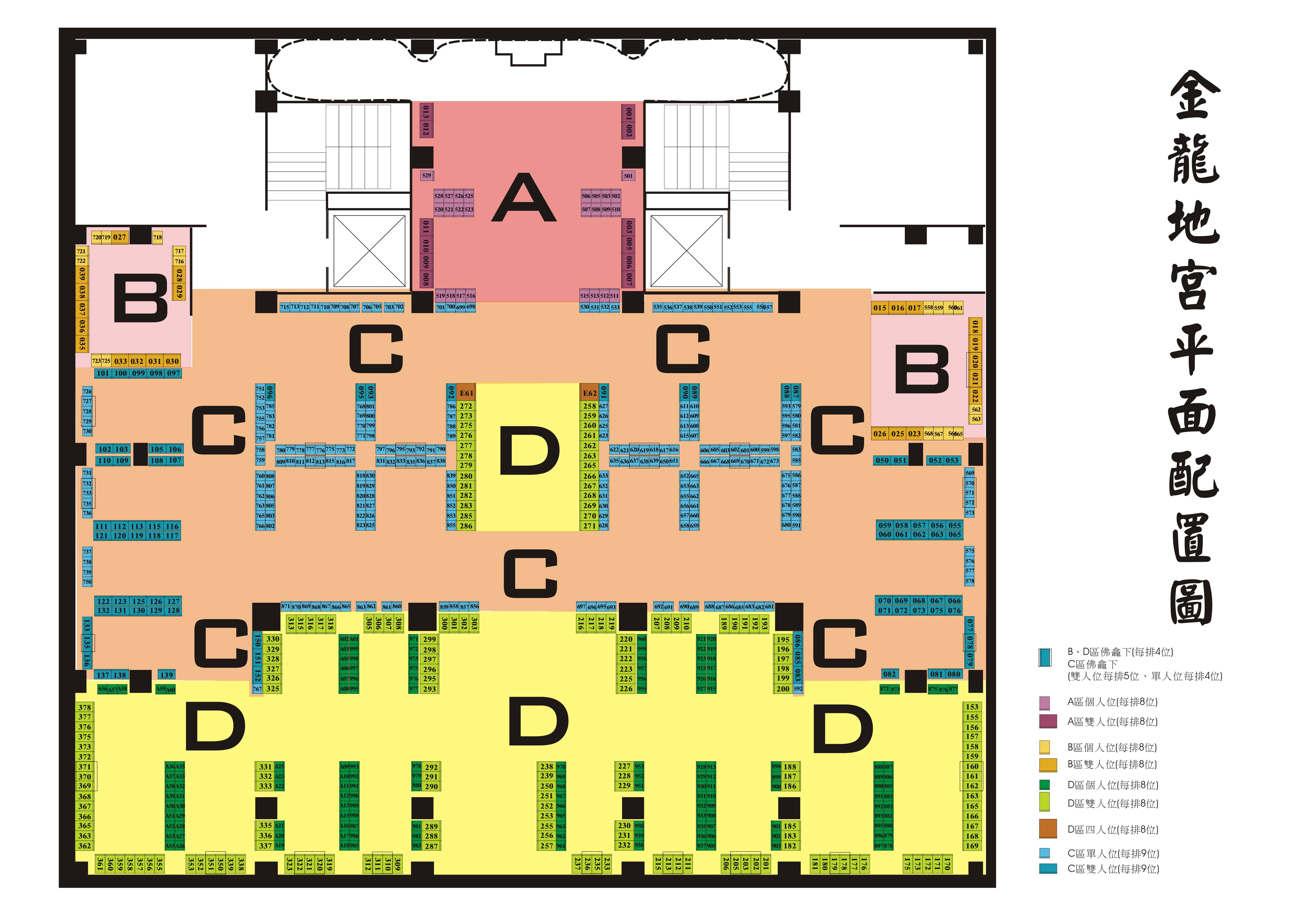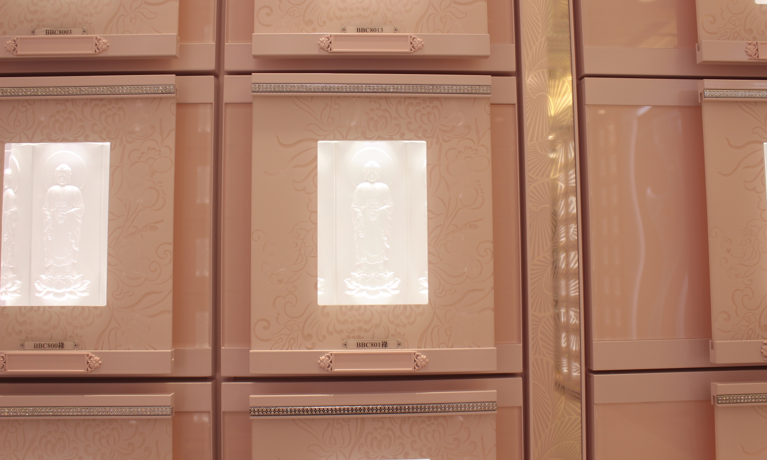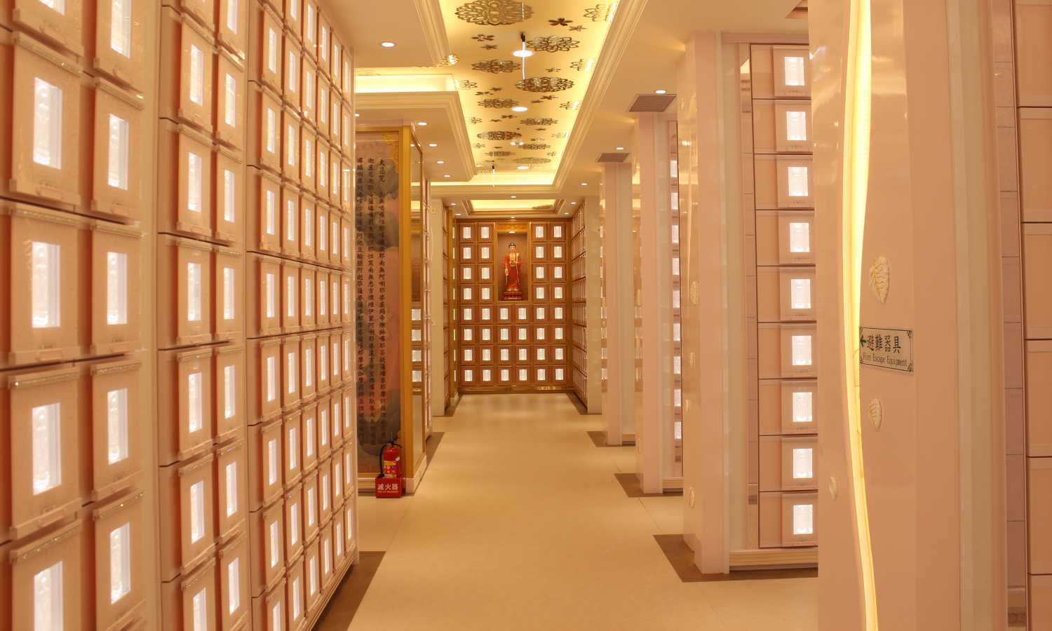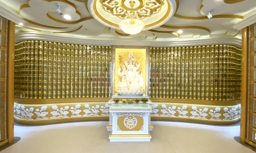 金龍地宮塔位區,本樓層分為A、B、C、D四區,A、B區特別加長深度的箱體前,可以安放先人特具紀念性的小物。整個樓層給人安寧祥和,精緻優雅的設計風格。