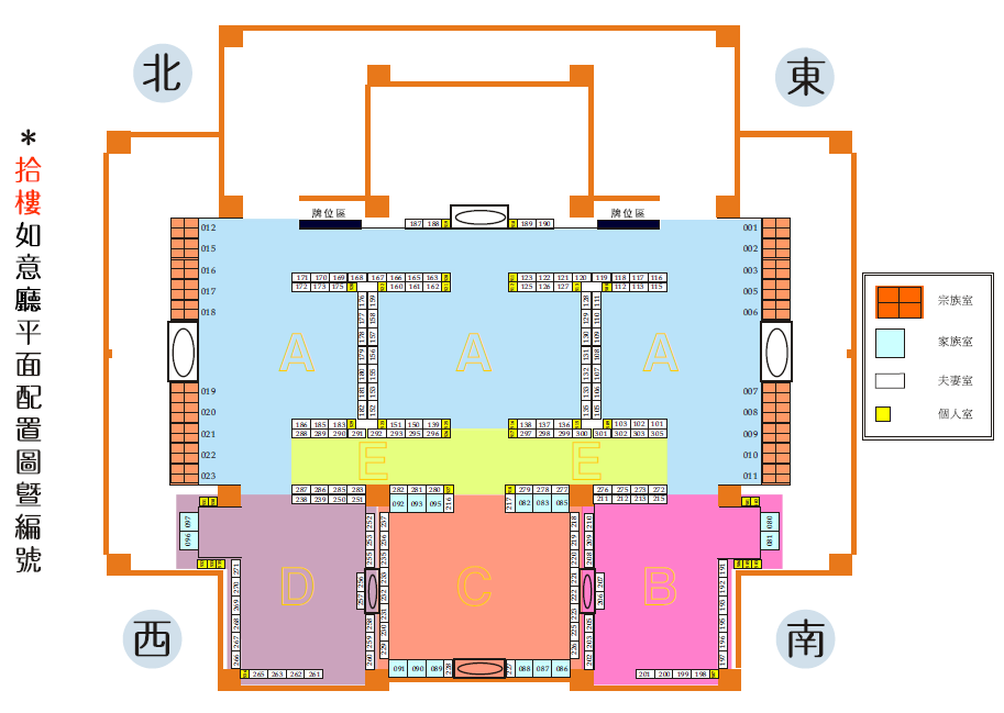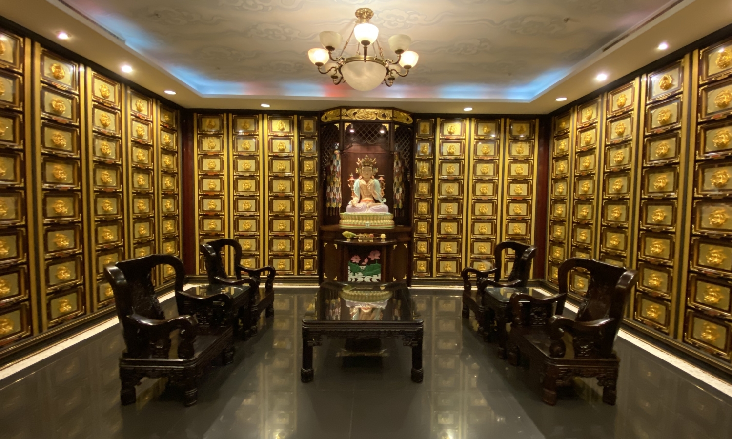 慎終追遠,尊天敬人。雲中高樹綠扶塔,無限美景,雨後好山青到門,有緣方居本著對先人的尊敬,『如意廳 』挑高四米,精緻、高品質的設計理念。莊嚴、肅穆的一〇八朵水晶蓮花,綻放璀燦風華。本樓層配置有宗族骨灰室、家族骨灰室、雙人骨灰室、個人骨灰室及福牌位(本樓層福牌位需配合塔位購買)。
