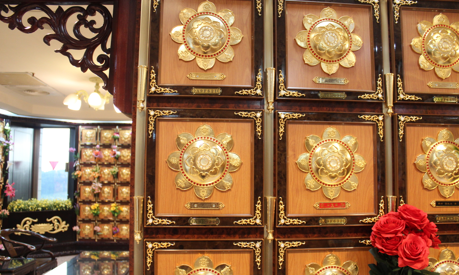 面板中蓮花圖騰代 表西方極樂淨土世界;中間圍繞蓮心48顆珠寶代表阿彌陀佛四十八大,願像徵得生極樂淨土。外圍蓮花瓣上之八吉祥圖騰:寶瓶、寶蓋、雙魚、蓮花、白螺、盤長、尊勝瞳、法輪,皆代表祈福往生者罪業解脫、離苦得樂,獲得圓滿的願力。